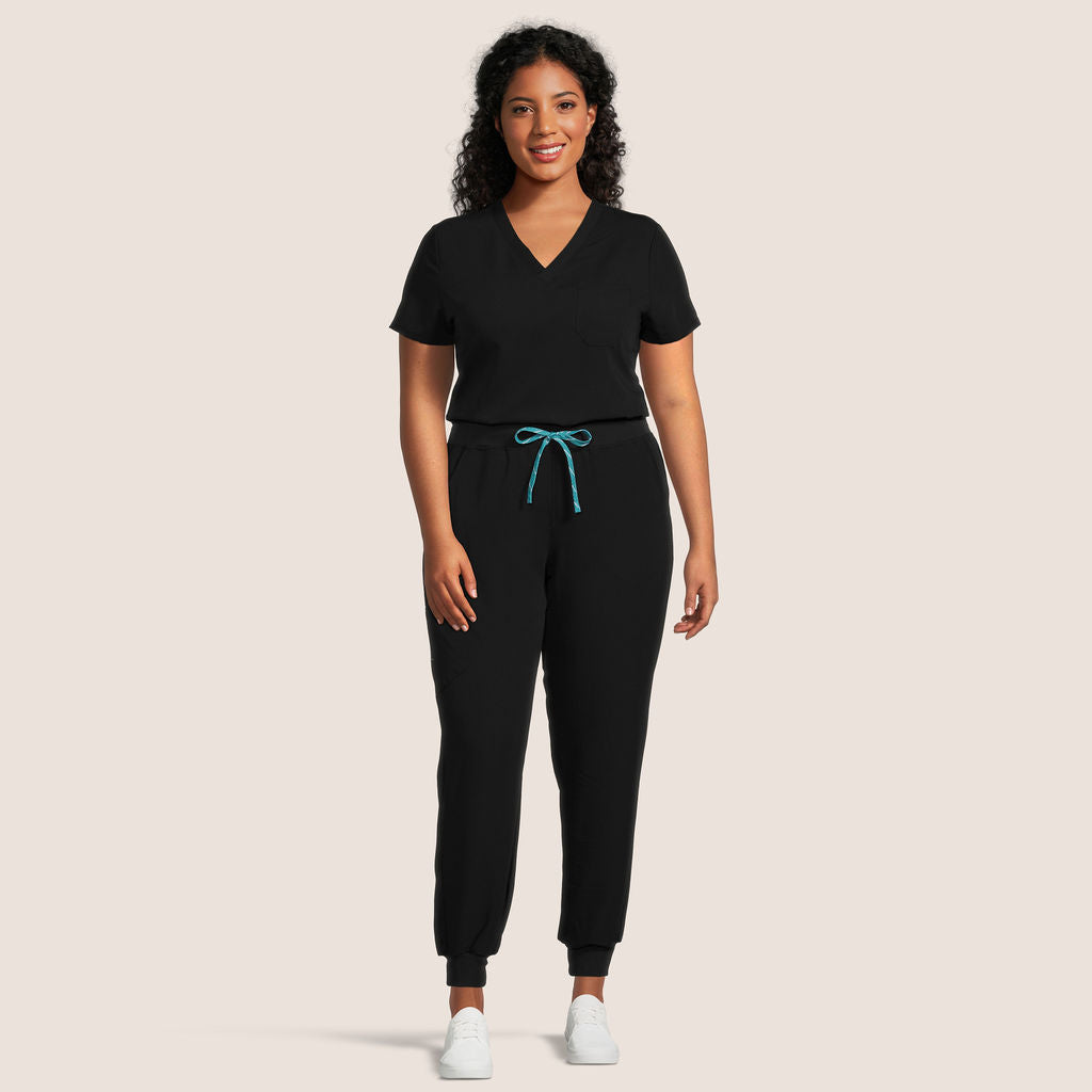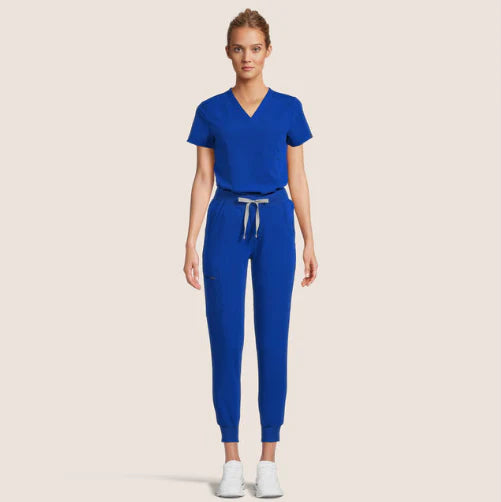 This professional scrub set is just what you need to start your long shift off right. The Jaro Joggers feature a fitted jogger hem and a high-rise, drawstring waistband allowing you to move and work without hesitation. Functionality provided with five pockets: two back, two front and one zippered cargo pocket on the right leg. While the V neck style top includes a pocket to the left chest, and two hidden pockets on the sides - looking great worn tucked or untucked.